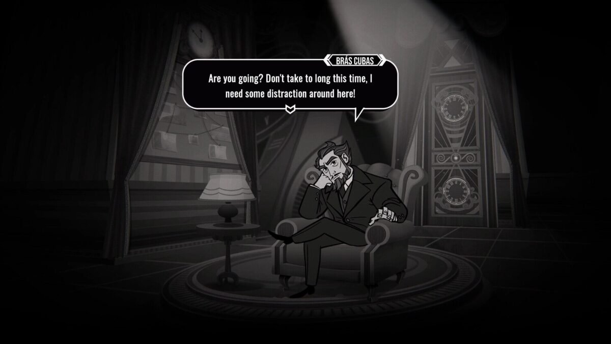 El difunto Brás Cubas es un tipo complejo, narcisista, que se hace odiar y querer al mismo tiempo, y él mismo sirve como tu confidente entre cada reinicio. Vas a interactuar con un elenco de sospechosos donde todos tienen secretos sucios. Al principio parece que sus vidas no tienen nada que ver, pero conforme avanzas, te das cuenta de que el tipo que viste caminando a las 3:00 p.m. por un callejón se iba a encontrar con la mujer que interrogaste en la mañana. Lo que quiero decir con esto, es que es un guion bastante bien armado, que va hilando cada momento del juego y nada es al azar.