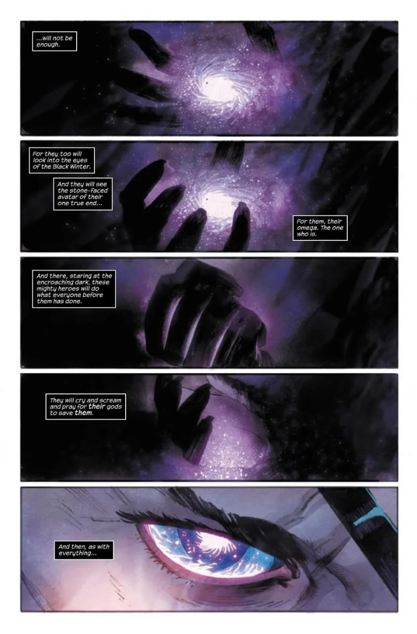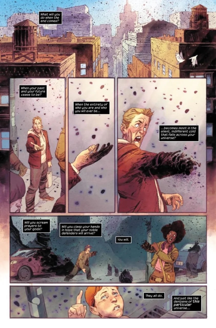 Aunque claramente no vemos nombres de los personajes, podemos ver referencias del Hombre de Acero, Flash y Linterna Verde, aparte de una muy clara al Diario el Planeta. Todo esto durante unos cuantos cuadros para que al final todos este mundo termine siendo consumido por una obscuridad que termina cubiendo el planeta.