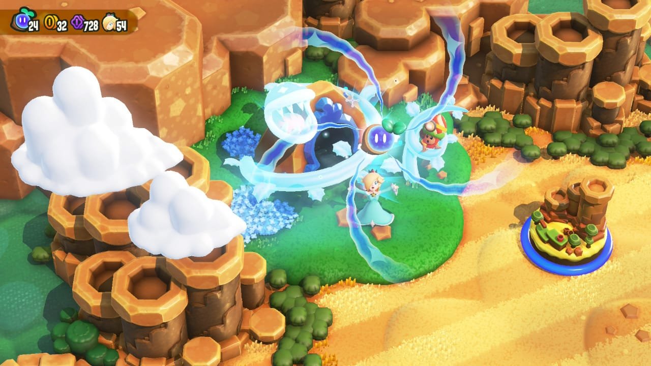 Dentro de los detalles nuevos al juego, encontramos como personaje jugable a Rosalina y un nuevo poder otorgado por una pequeña maseta, donde nos permitirá lanzar plantas giratorias para hacer volar a nuestros enemigos, o incluso alcanzar objetos que con un simple salto no seriamos capaces de obtener.
