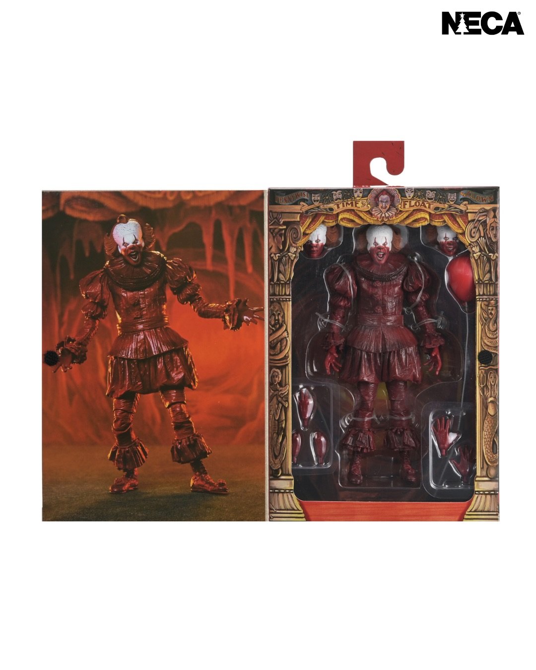 De pie, a escala de 18 cm, Pennywise presenta una decoración espantosa y ensangrentada, además de cabezas y manos intercambiables. Viene en una caja con ventana y solapa frontal abatible, ideal para coleccionistas.
