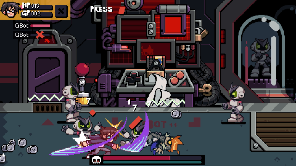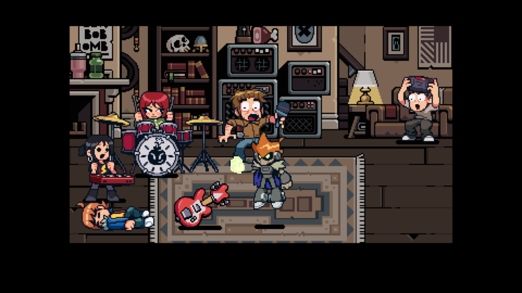 Las referencias a elementos de la cultura pop siguen siendo parte esencial de ‘Scott Pilgrim EX’, y aunque en esta ocasión el HUB ya no es una copia descarada del mapa de Supe Mario, sí podemos encontrar varios elementos y referencias a otras franquicias. Por ejemplo Scott lanza ataques similares (por no decir idénticos) a los que usan personajes de Street Fighter, Robot lanza ataques como si fuera Mega Man, hay un jefe que se transforma en Myotismon de Digimon, un escenario llamado “Casa Vania”, un claro juego de palabras referente a Castlevania, enemigos que son imitaciones de Scorpio… sin duda una lluvia de referencias que le sacarán una sonrisa a más de uno y que encajan perfecto con el diseño colorido y retro que desean emular.