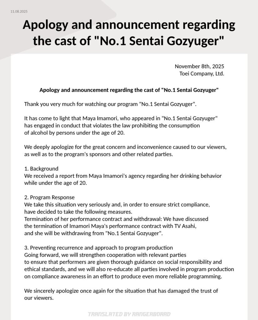 La actriz japonesa Maya Imamori ha sido retirada de la serie Super Sentai Gozyuger tras un escándalo por consumo de alcohol siendo menor de edad.