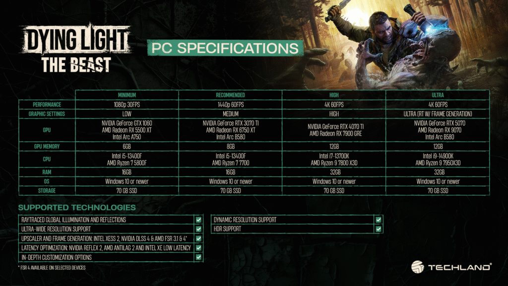 Techland revela los requisitos del sistema para PC y computadoras portátiles para Dying Light: The Beast, lo que permite a los jugadores saber claramente qué necesitan preparar para el lanzamiento del juego.
