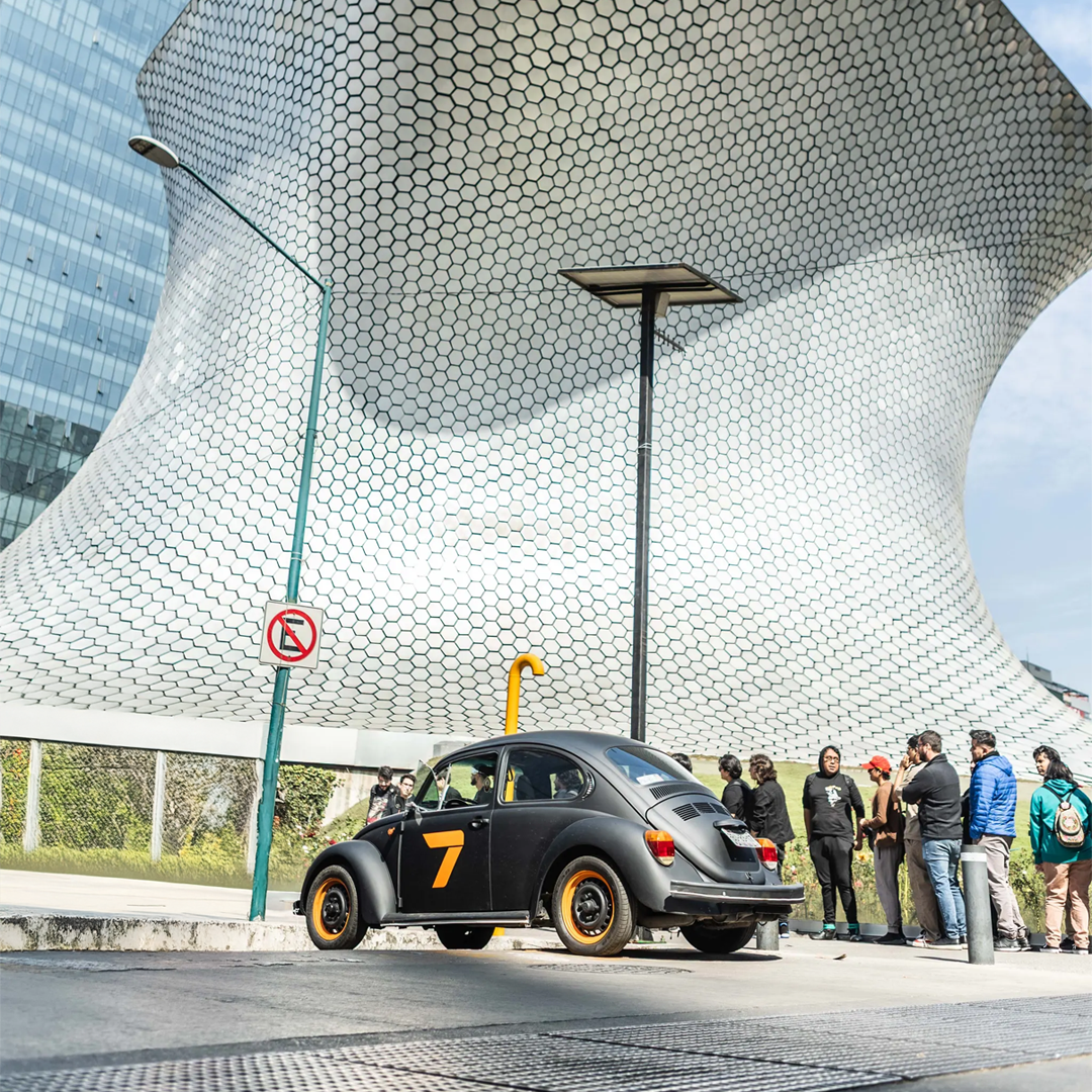 A las 2:00 p.m., el Museo Soumaya se convirtió en el fondo perfecto para el BO7chito. Oficinistas, familias y curiosos se sumaron a la experiencia, tomándose fotos y compartiendo el momento en redes. La arquitectura plateada del museo contrastó con el auto, creando una postal inesperada